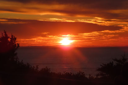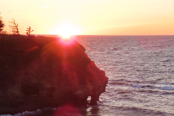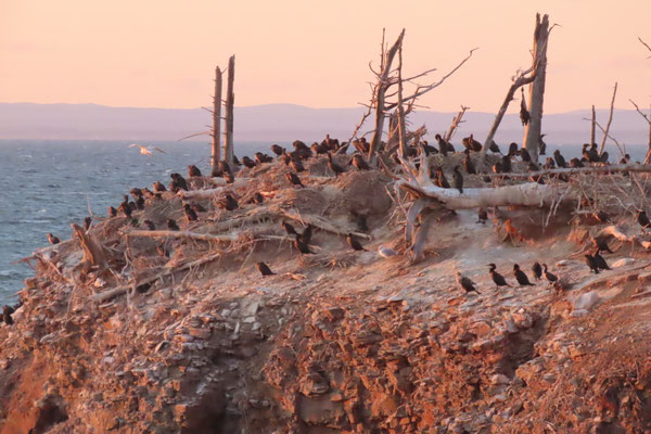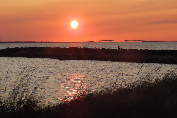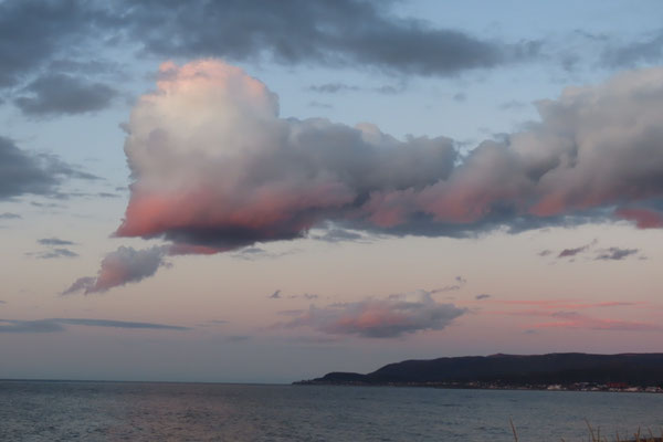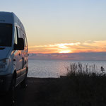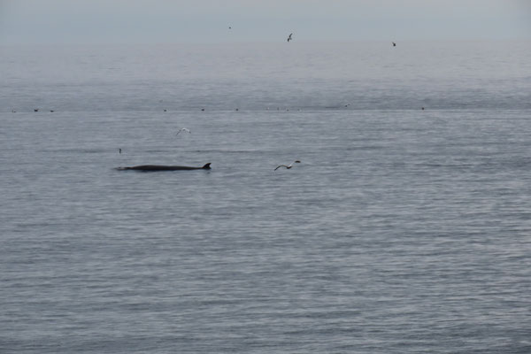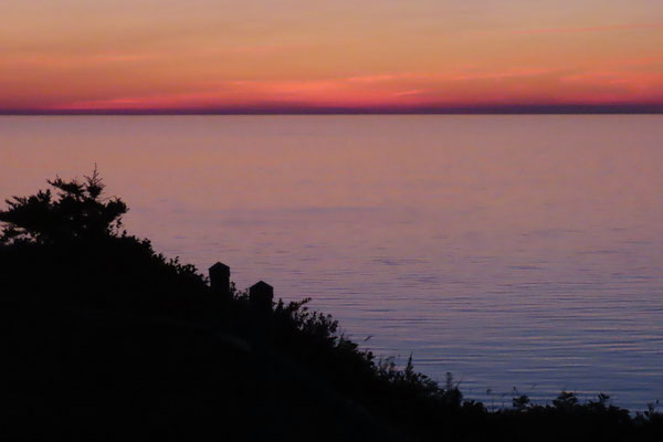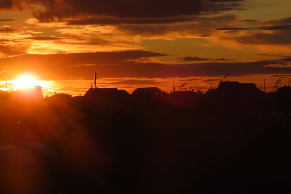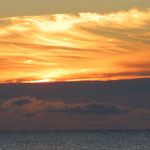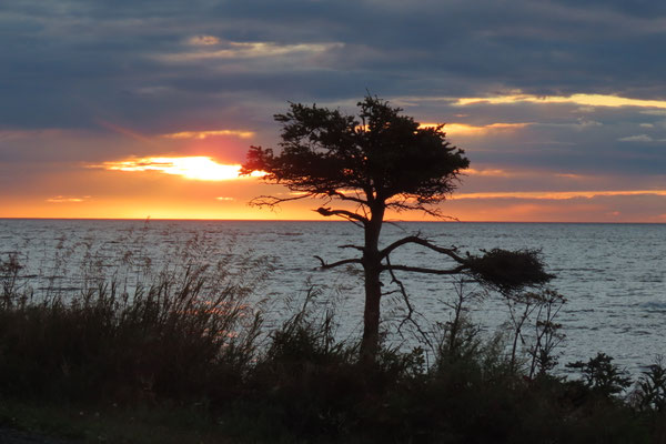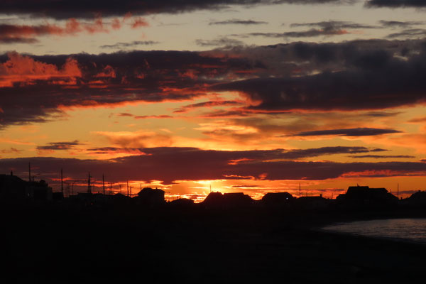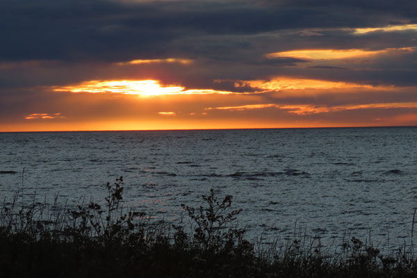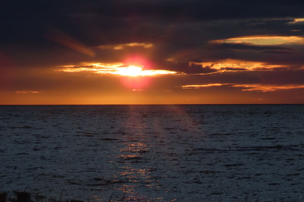 Weiter draußen erkennen wir mit dem Fernglas drei Wale, die aber für ein Foto doch zu weit weg sind. Abends erneut ein sehr stimmungsvoller Sonnenuntergang.