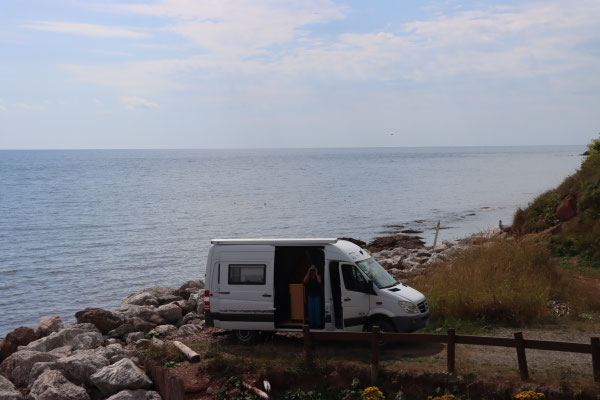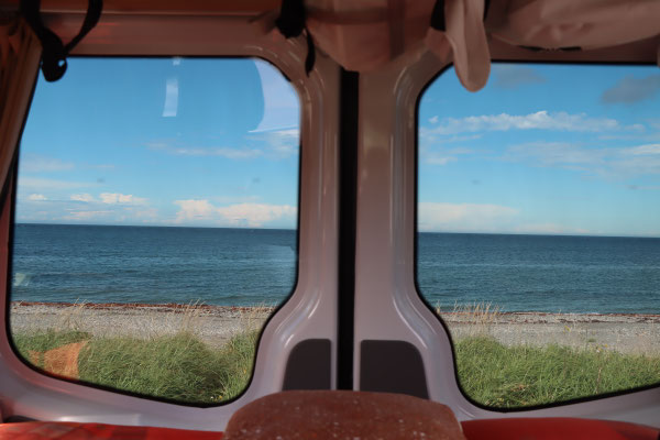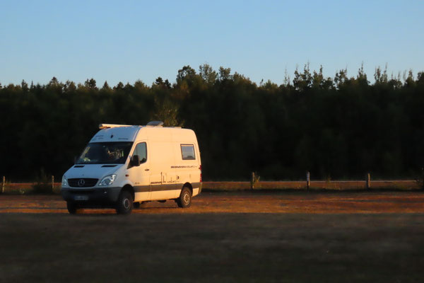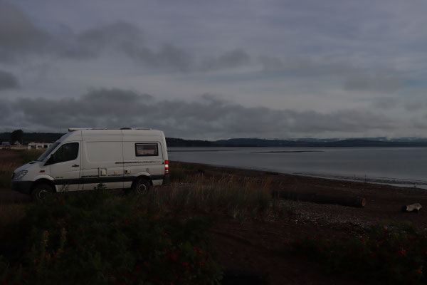 Wir beziehen einen wunderschönen Platz direkt am Strand. Keine Verbotsschilder, daher entschließen wir uns, den ganzen Tag hier zu verbringen und auch über Nacht stehen zu bleiben.