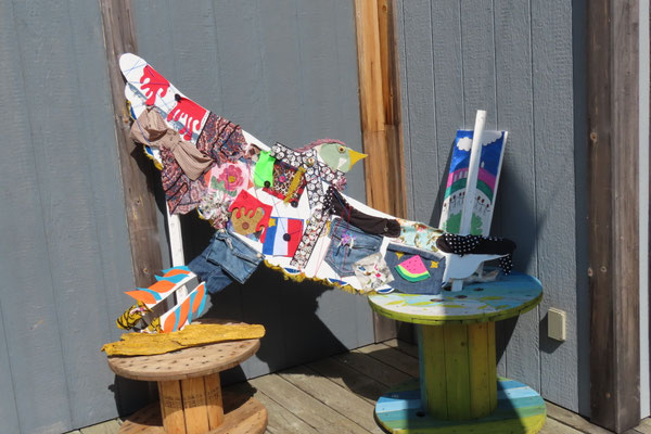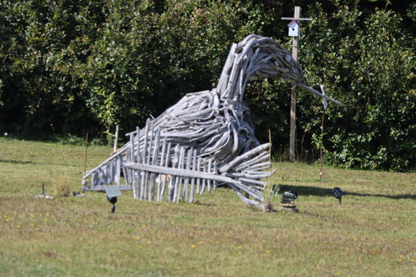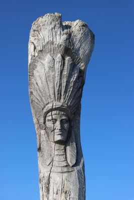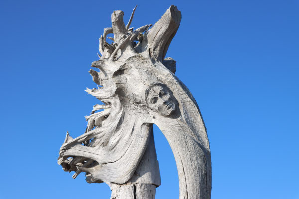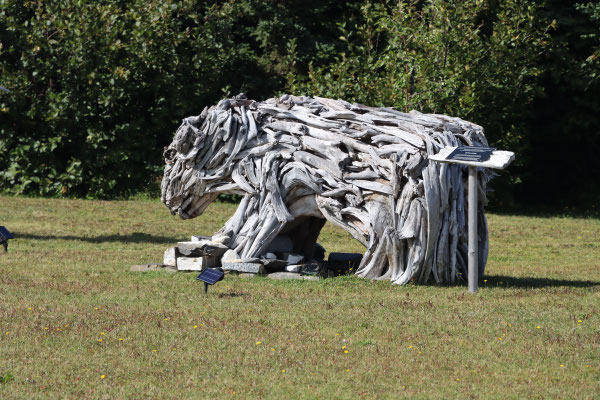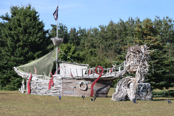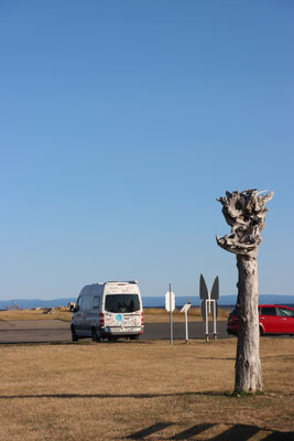 Der kleine Campingplatz beim Leuchtturm bietet eine gigantische Sicht auf den Strom. Wir geben die Hoffnung Wale zu sehen nicht auf. Für morgen ist Regen angesagt, da werden wir wohl hier bleiben. Was aus Schwemmholz alles gebastelt werden kann, sehen wir bei einem der wenigen Häuser.