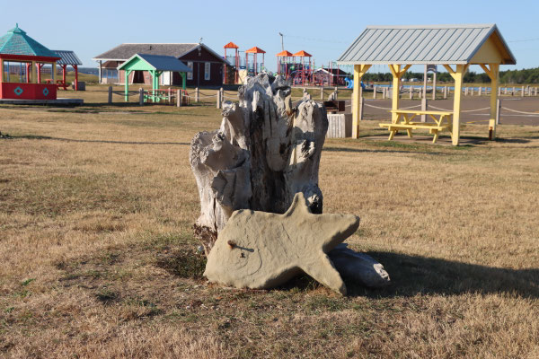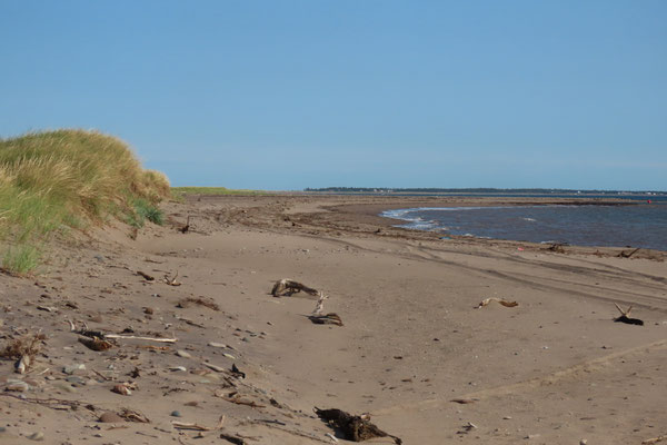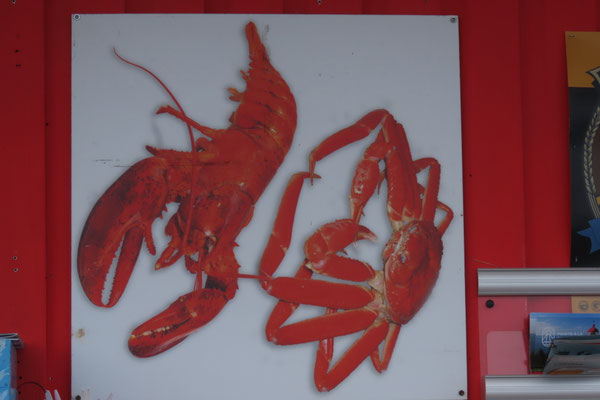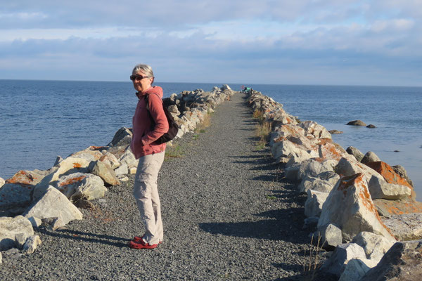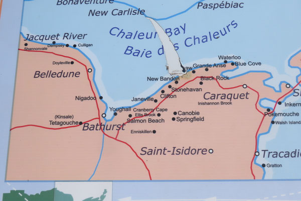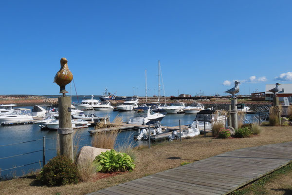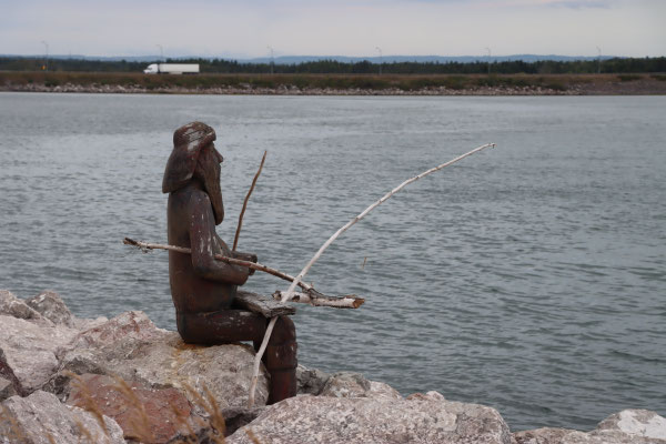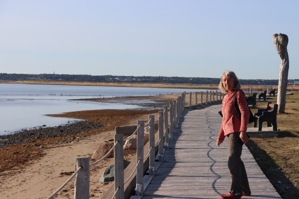 Sternenklarer Himmel bei Mondschein. Nach dem morgendlichen Strandspaziergang wollen wir eigentlich in Shippagan im wohlklingenden Restaurant "Octopus" zu Mittag essen. Aber zu unsere Enttäuschung gibt es nur nicht gerade einladende Fast Food. So fahren wir nochmals die 25 km zum Hafen von Caraquet. Dort essen wir ganz hervorragend und zur Verdauung gehen wir nochmals am künstlerisch gestalteten Uferweg.