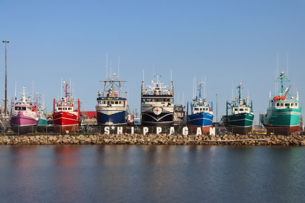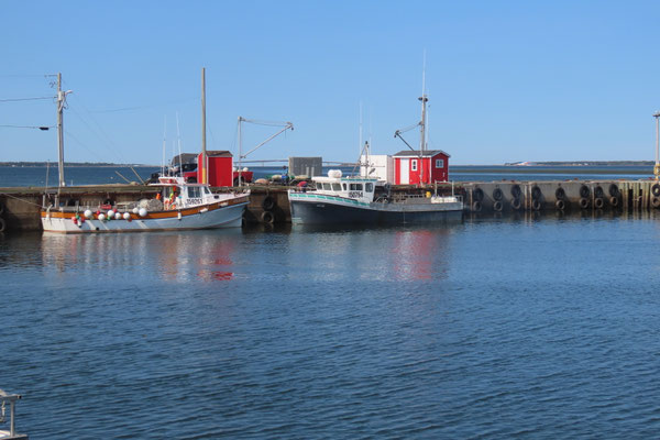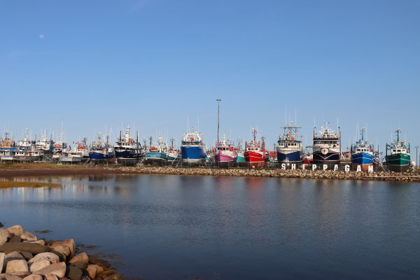 Der Platz neben der stillgelegten Fischfabrik lässt uns eine ruhige Nacht verbringen. Am Ortsende von Shippagan sind einige Trawler sauber hergerichtet und am Ufer aufgereiht, Am Fischhafen von