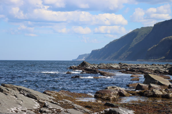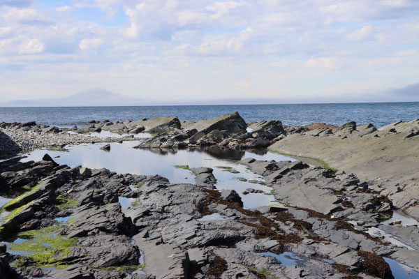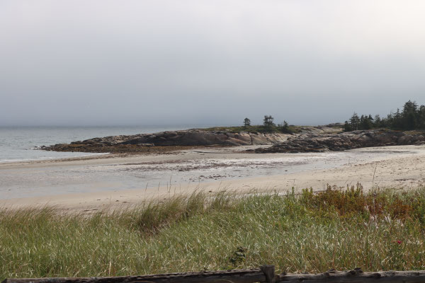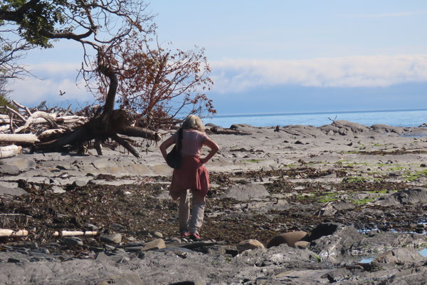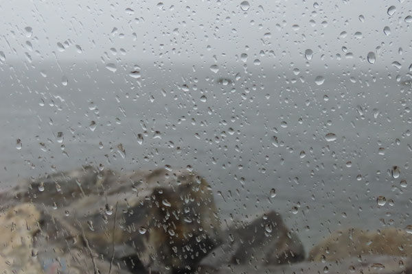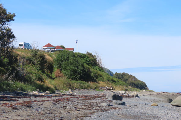 Nachts regnet es immer wieder, morgens ebenfalls bis ungefähr 10:30 Uhr. Ein Halt an einem kleinen Rast Platz, da scheint sogar für eine halbe Stunde die Sonne. Die Landschaft am felsigen Sandstrand ist dennoch schön.