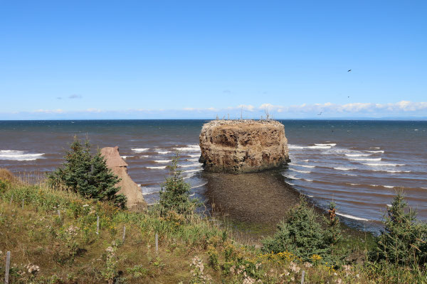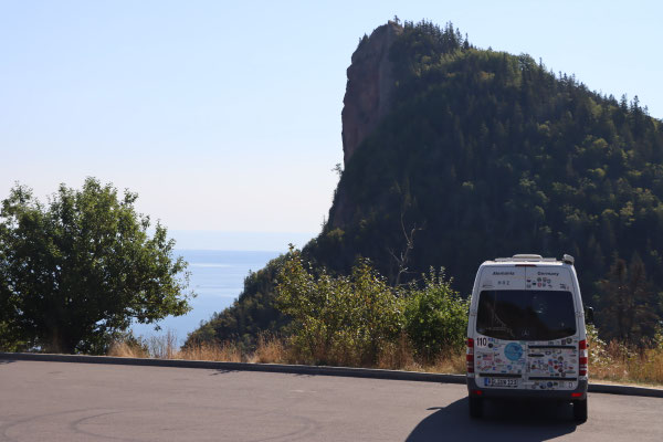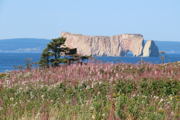 Die Nacht in Gaspe beim Mc Donald ist überraschend ruhig. Um 7:30 Uhr rollt der Hobel dann an der Küste Richtung Perce. Dieser Streckenabschnitt ist wieder ziemlich verbaut, auf die schöne Landschaft ist ein Blick nur selten möglich. Ein paar Kilometer vor Perce gibt es aber einen schönen Aussichtspunkt. Der Ort selbst hat sich seit 2018 zu einem Touristenhotspot entwickelt .