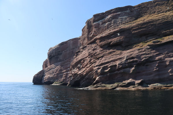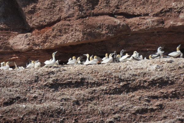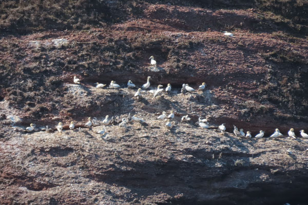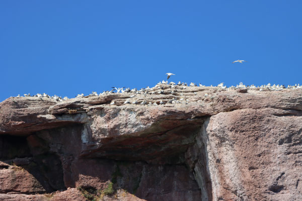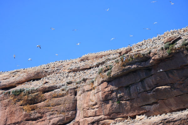 Das Boot umrundet erst die Insel bevor wir in dem kleinen Hafen an Land gehen. In den steilen Felswänden sitzen die Basstölpel eng beieinander und einige Seehunde zeigen sich auch schon,