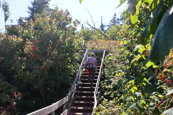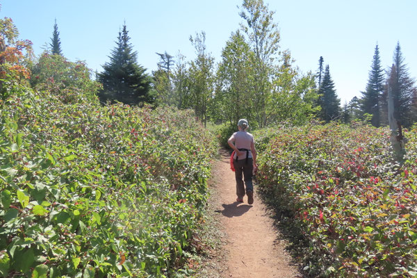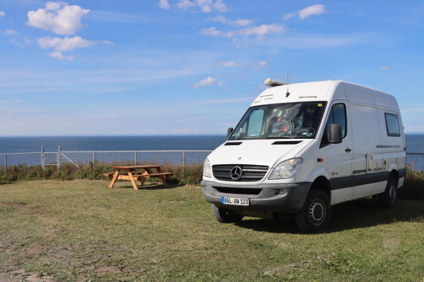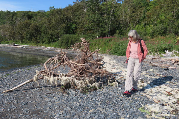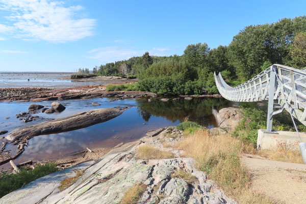 Leider sind viele Aussichtspunkte, die wir von 2018 kennen dem einem wahnsinnigen Bauboom zum Opfer gefallen. Daher sehen wir dieses Mal auch keine Wale, Die kleinen Orte platzen aus allen Nähten und sind nicht wieder zu erkennen. Die Folge ist auch ein irrer Verkehr mit vielen LKW's- ein etwas anderes Kanada. Nur der kleine Trail bei einer Hängebrücke ist noch geblieben und zur vormittäglichen Kaffeepause finden wir doch noch einen schönen Platz.
