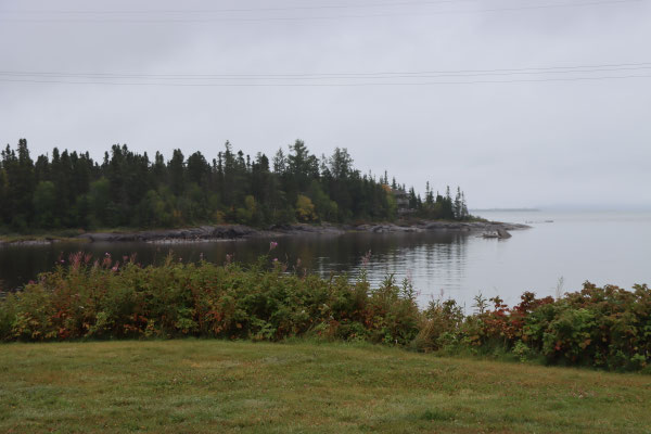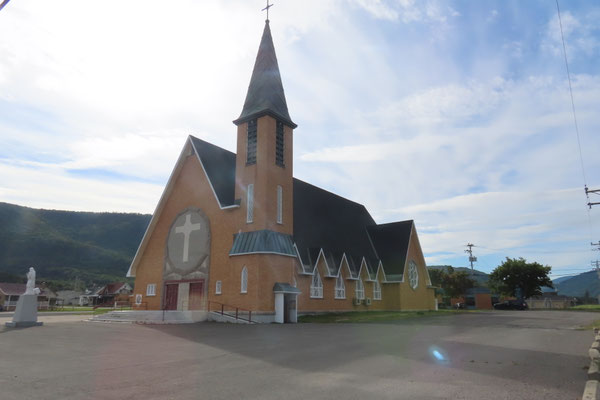 Ufer des Stromes total zugebaut. Die Orte Baje Trinite, Port Cartier und Sept de Iles sind richtige Großstädte, wobei im Reiseführer von 2018 geschrieben steht, dass diese Route etwas für Einsamkeitsfans ist. Eigentlich wollen wir in Sept de Illes übernachten, haben schon einen Stellplatz bei einem Hotel bezogen. Aber eine Stunde später sind wir uns einig, hier nicht zu bleiben. Wir fahren daher bis Riviere Penecote zurück, wo wir bei einer Kirche einen akzeptablen Platz finden.