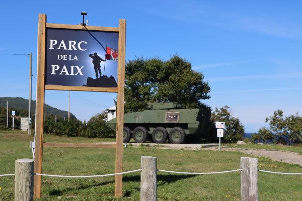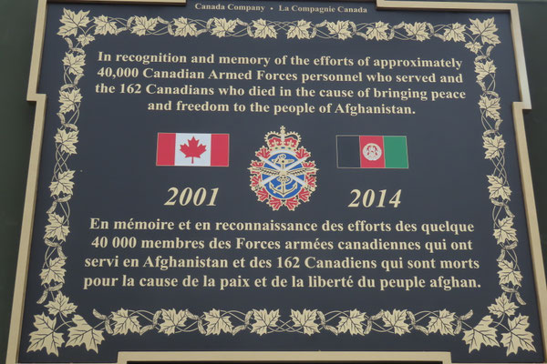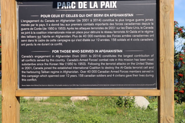 Kurz nach 6 Uhr weckt uns wieder unsere Sonne. Wir können wieder "unsere" Seehunde beobachten. Nach dem Vormittagskaffee geht es 19 km weiter bis Parc de la PAIX. Das ist eine Gedenkstätte für den Einsatz der kanadischen Soldaten von 2001 -2016 in Afghanistan.