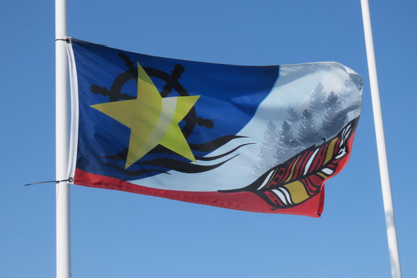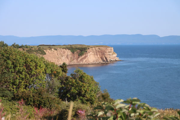 Steilküste der Chaleur Bay. Die Flagge von Acadien ist allgegenwärtig.
