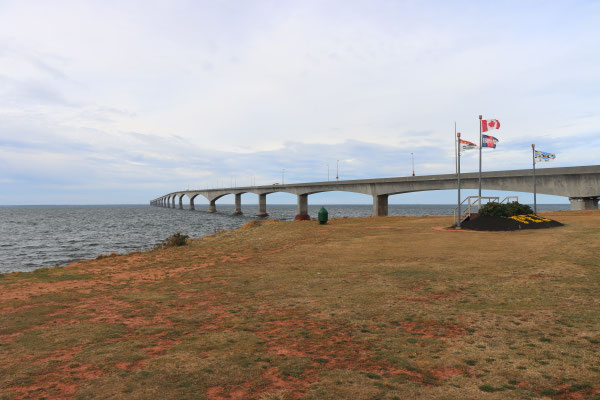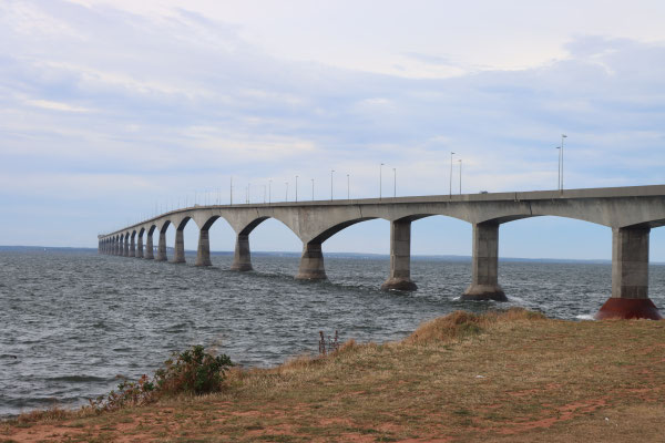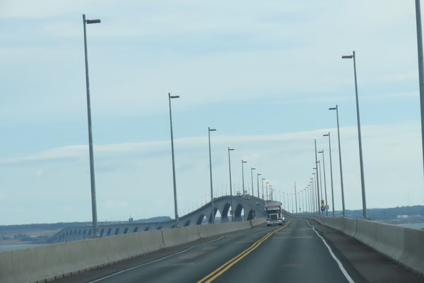 Morgens lacht noch für eine Stunde die Sonne, dann zieht es zu und regnet ein paar Mal kurz und gegen Abend ist alles wieder gut. Es dauert nicht lange und wir kommen an die gewaltige Brücke die nach Prince Edward Island führt. Mit 13 km eine der längsten Brücken der Welt. 6000 Arbeiter haben dieses grandiose Bauwerk von Oktober 1993 bis Mai 1997 erstellt.