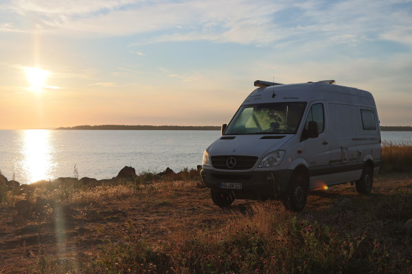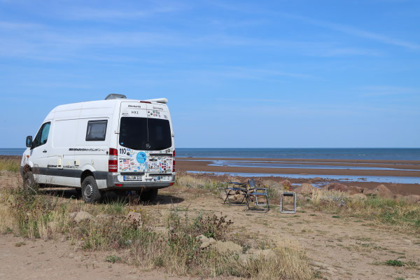 Wir beziehen einen wunderschönen Platz direkt am Strand. Keine Verbotsschilder, daher entschließen wir uns, den ganzen Tag hier zu verbringen und auch über Nacht stehen zu bleiben.